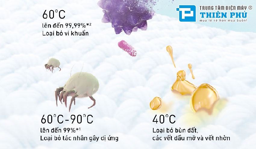 Ngoài ra, sản phẩm này còn được trang bị tính năng sấy diệt khuẩn giúp loại bỏ tới 99%* vi khuẩn bằng cách giữ nhiệt độ ở mức xấp xỉ 55°C trong khi sấy, để bảo vệ sức khỏe gia đình bạn đồng thời luôn giữ quần áo ở trạng thái tốt nhất.