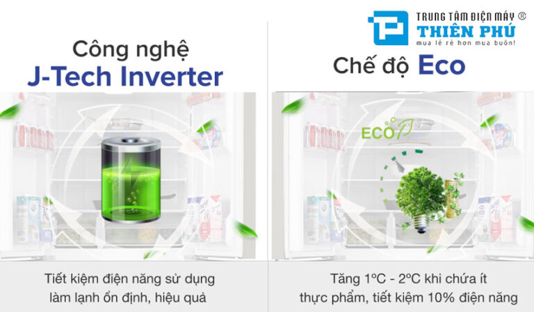 So với các dòng tủ lạnh thông thường, J-Tech Inverter giúp giảm tiêu thụ điện năng đáng kể, có thể lên đến 30–50%. Ngoài ra, công nghệ này còn giúp tủ vận hành êm ái, hạn chế tiếng ồn và kéo dài tuổi thọ máy nén. Điều này đặc biệt phù hợp với những gia đình có không gian sống yên tĩnh hoặc sử dụng tủ lạnh đặt gần khu vực sinh hoạt chung.